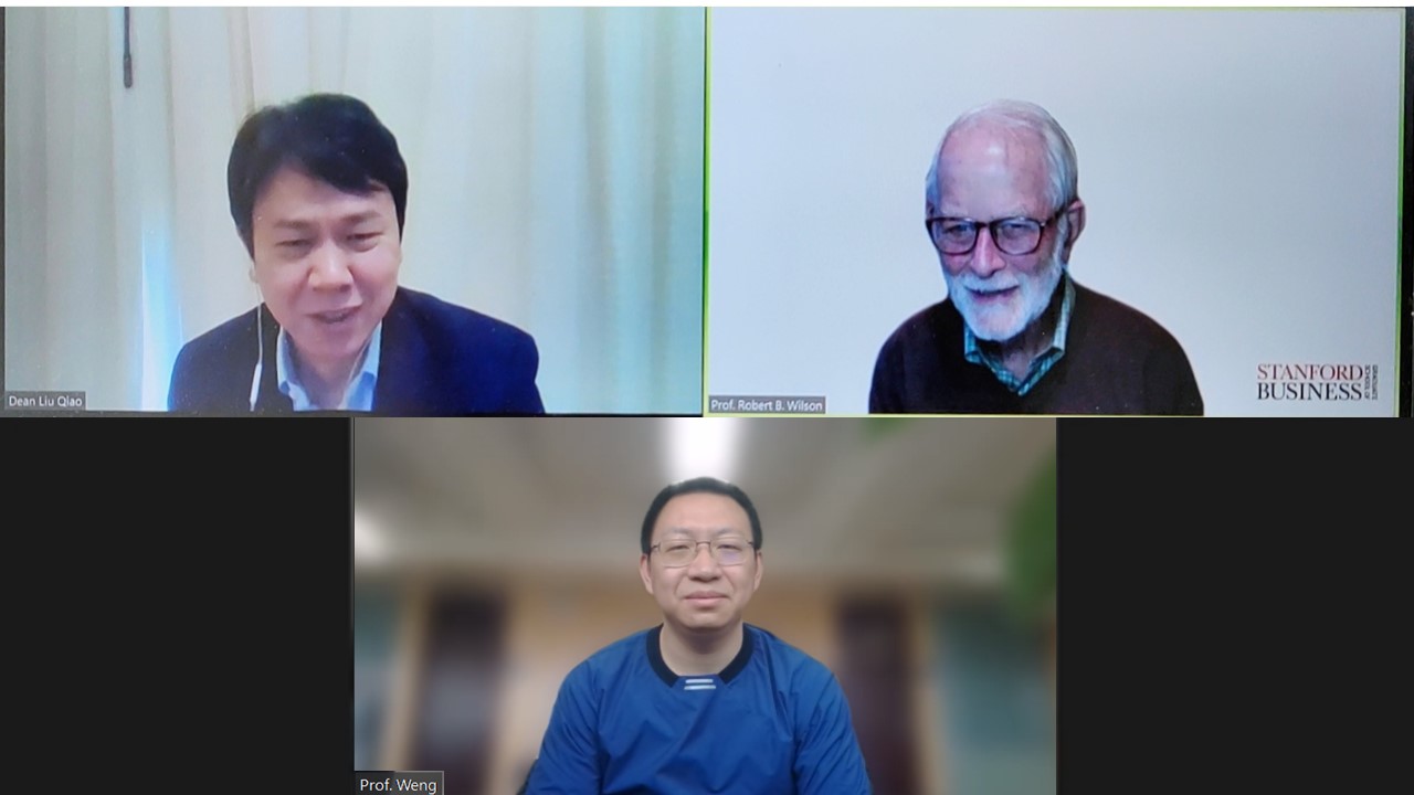 4月22日上午,2020年诺贝尔经济学奖得主、斯坦福大学教授罗伯特·威尔逊(Robert B. Wilson)受欧美大片ppt免费大全光华管理学院和欧美大片ppt免费大全斯坦福中心邀请,参与了“光华思想力”线上研讨会。光华管理学院院长刘俏教授对话威尔逊教授,就基础理论研究与实际应用、商学院教学与人才培养等话题进行了愉快而深入的探讨,共吸引来自20个国家和地区的1200余名观众在线参与。研讨会由光华管理学院经济学教授翁翕主持。
